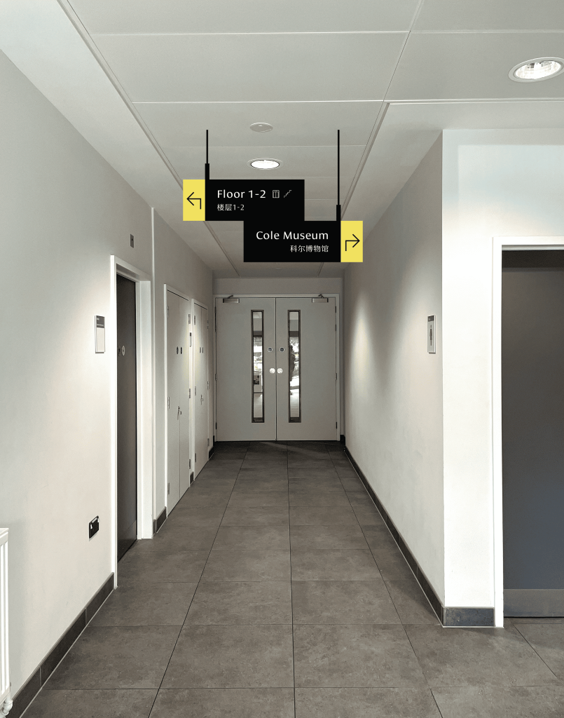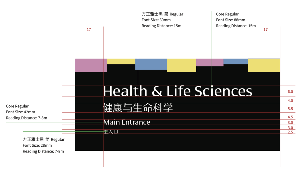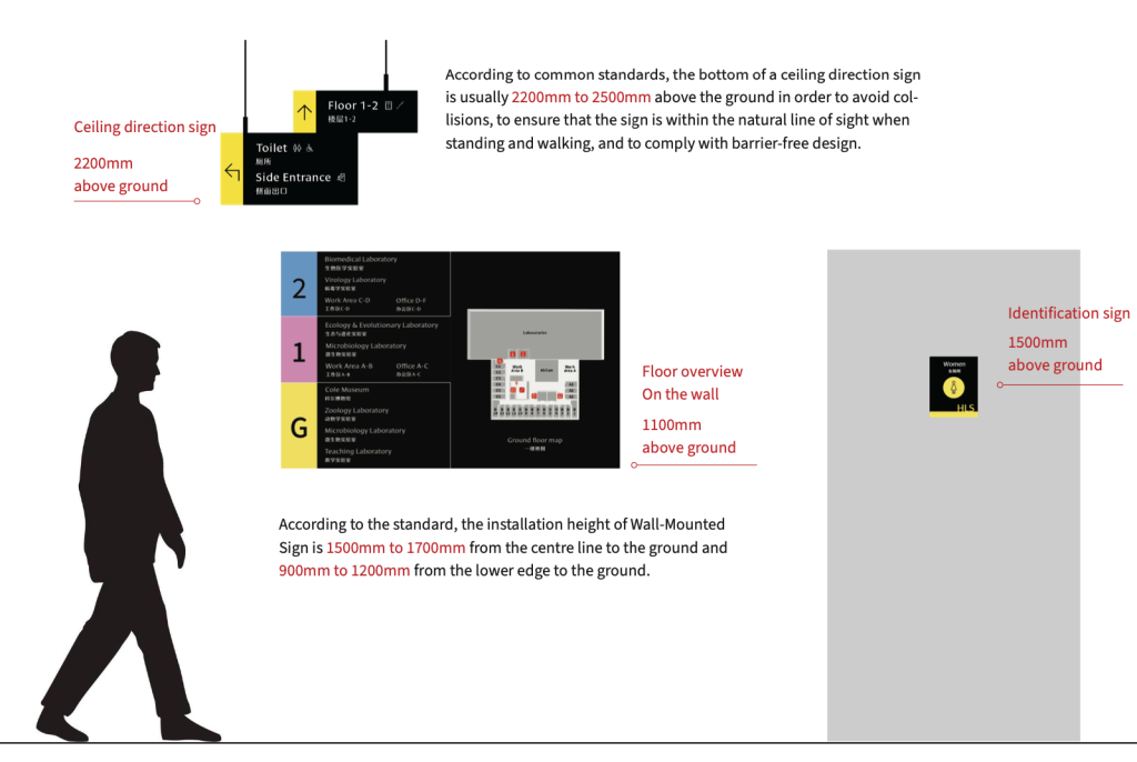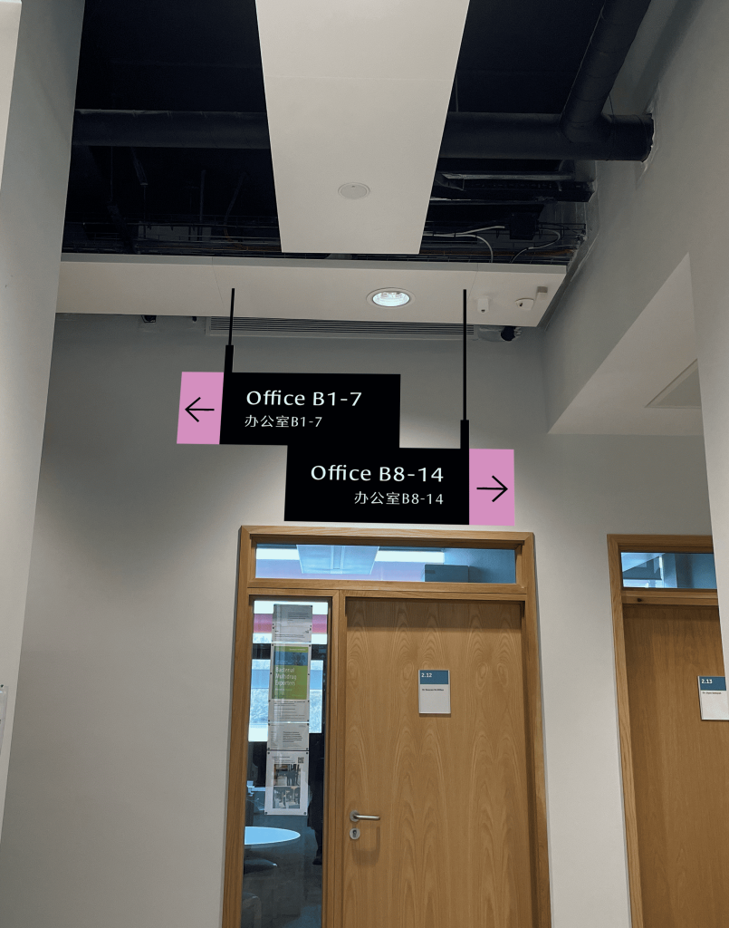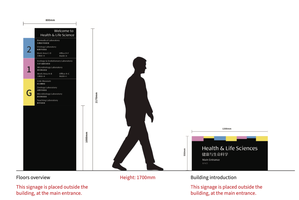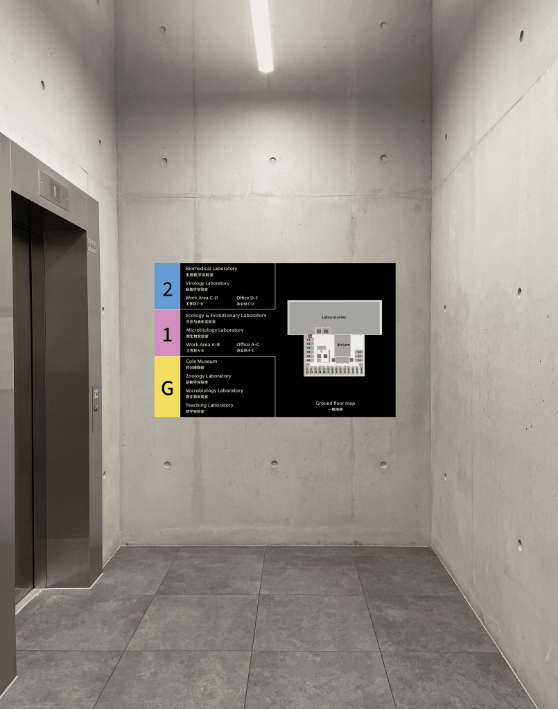 A wayfinding system was proposed for the Health and Life Sciences Building at the University of Reading. Through the external and internal signage design within this building, users can more conveniently locate their destinations. The signage design primarily employs both Chinese and English languages, utilising three distinct colours to distinguish different floors.
